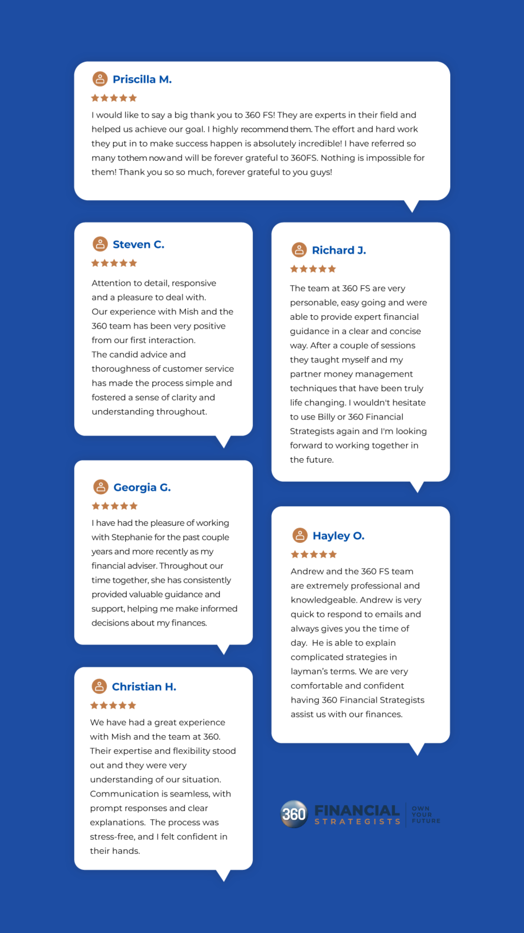 I really appreciate the kind and sound advice from 360 Financial Strategists. They took the trouble to deeply understand my personal preferences and situation before providing financial guidance. Patrick is also trustworthy, reliable and dependable - I very grateful for his advice on financial strategy and execution.